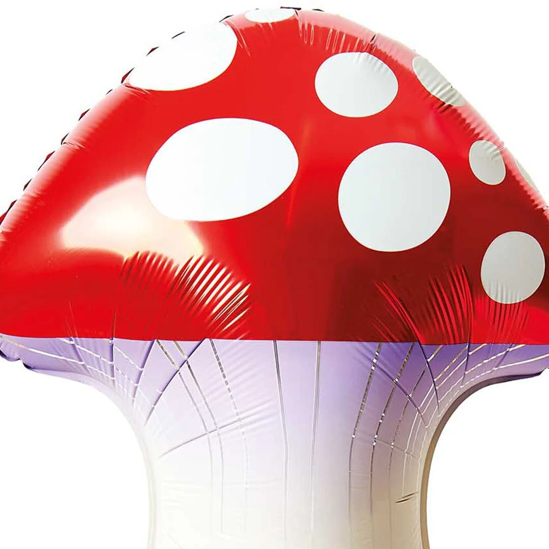 Op een grote paddenstoel rood met witte stippen. Met de folieballon 'Folienballon - Schrooom Rot' in de vorm van een paddenstoel creëer je een sprookjessfeer op het feest.