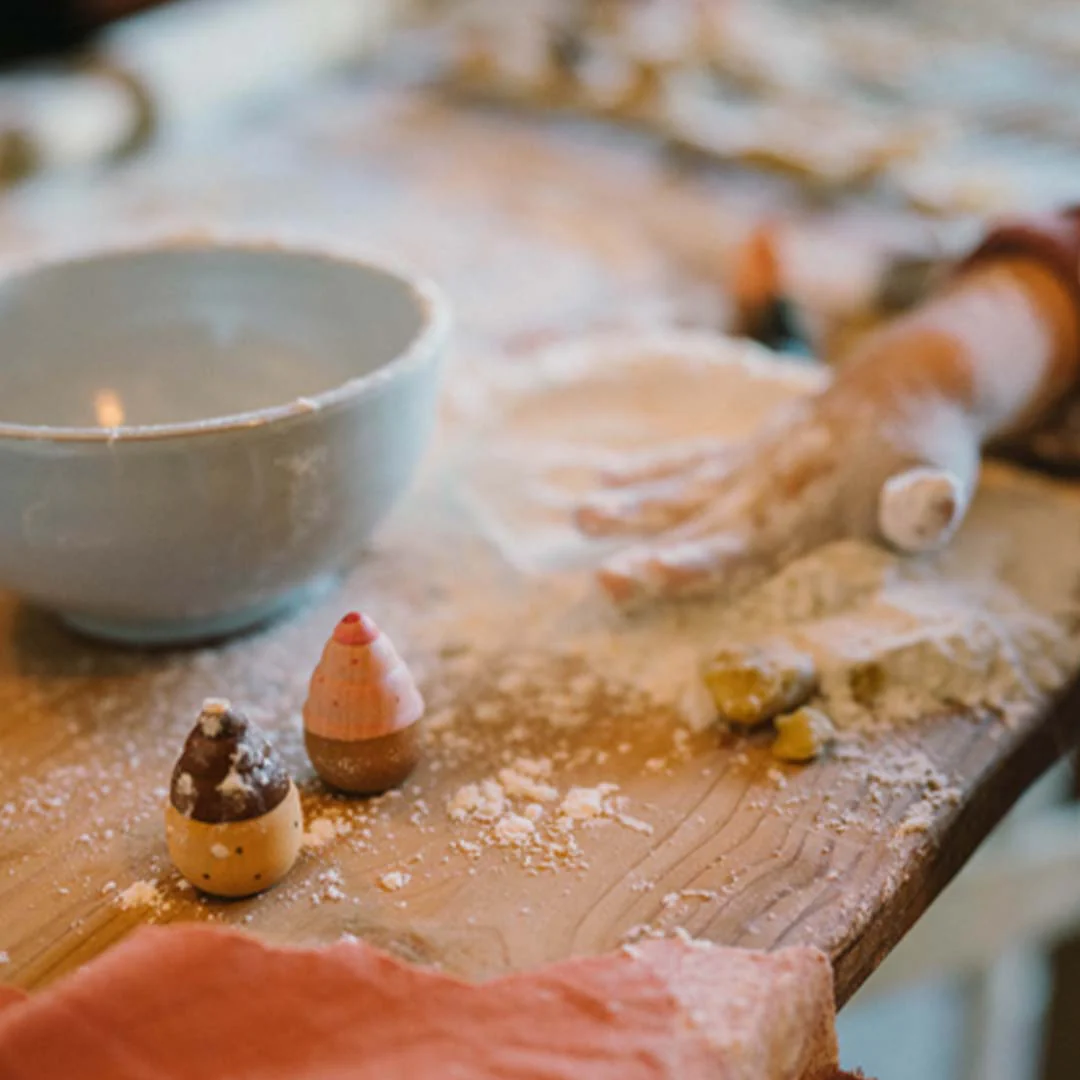 De set bestaat uit 12 stuks bakwaren in verschillende vormen met een grootte van 1 tot 4 centimeter. De loose parts liggen prettig in de hand en passen moeiteloos in kleine pannetjes, mandjes of houten schaaltjes. Kinderen sorteren, stapelen, combineren en verzinnen zo hun eigen spel. Vandaag een marktkraam, morgen een feestelijk ontbijt.Ā