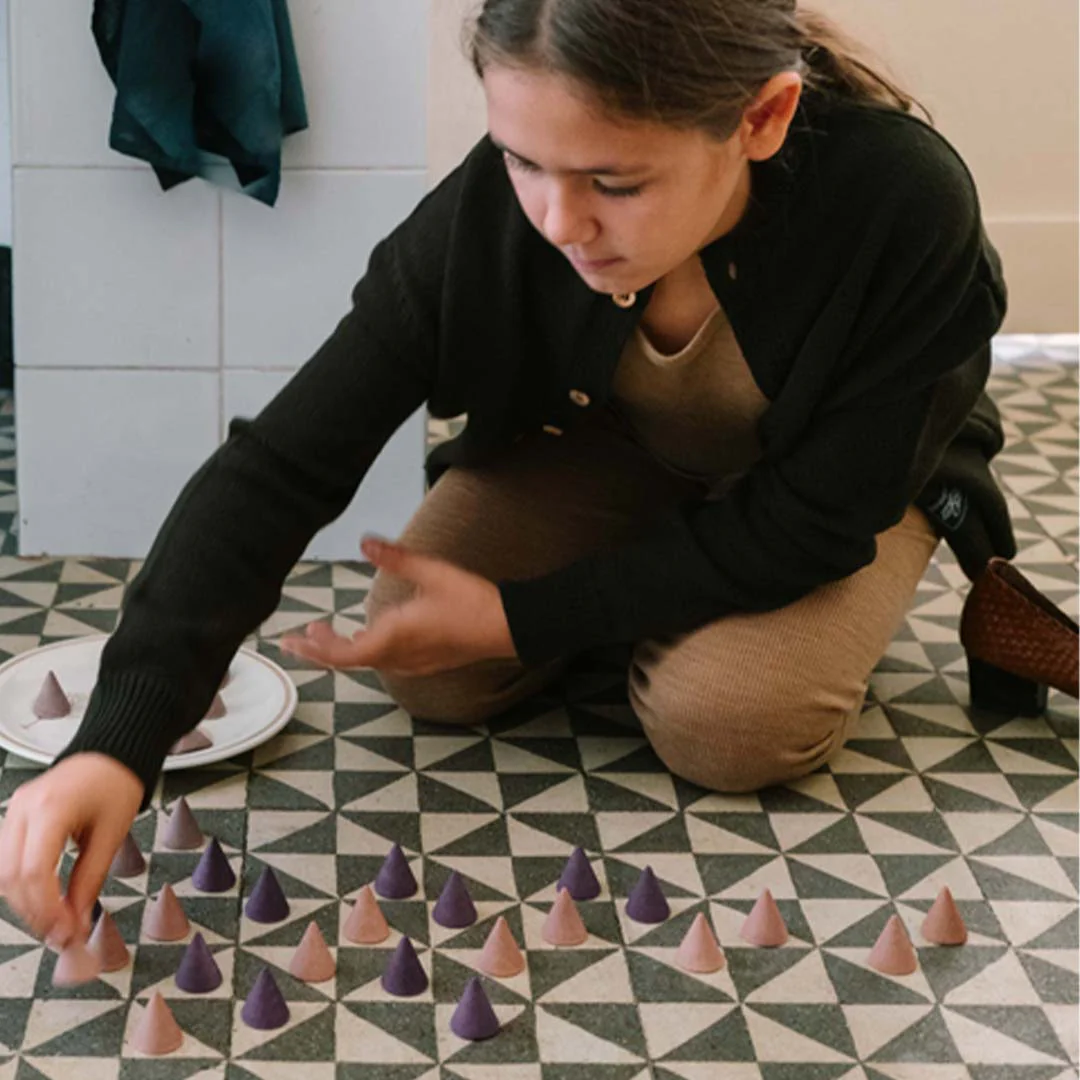 De set bestaat uit 36 vrolijke kegeltjes in verschillende kleuren. De loose parts liggen prettig in de hand en zetten aan tot creatief spel, of ze nu in een fantasielandschap terechtkomen, een poppenhuis versieren of dienstdoen als vrolijke versiering op de seizoenstafel. Door de eenvoudige vormgeving kunnen kinderen hun eigen verhalen en spelvormen creëren en ontstaat er steeds iets nieuws.