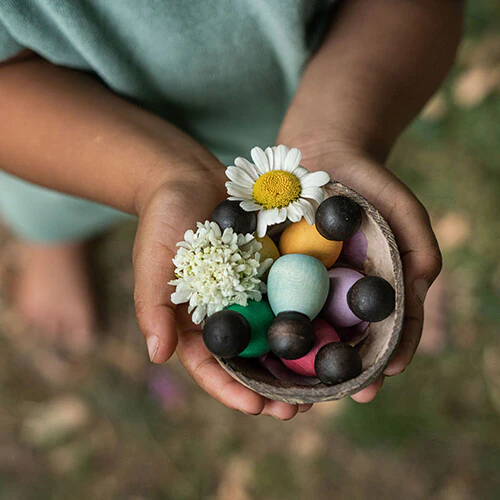 Een set van zes kleine houten 'Nins® bebes' van het Spaanse merk Grapat in zes tinten in een houten kom. Deze speelgoedset biedt de mogelijkheid om een andere generatie toe te voegen aan de Nins® poppetjes.