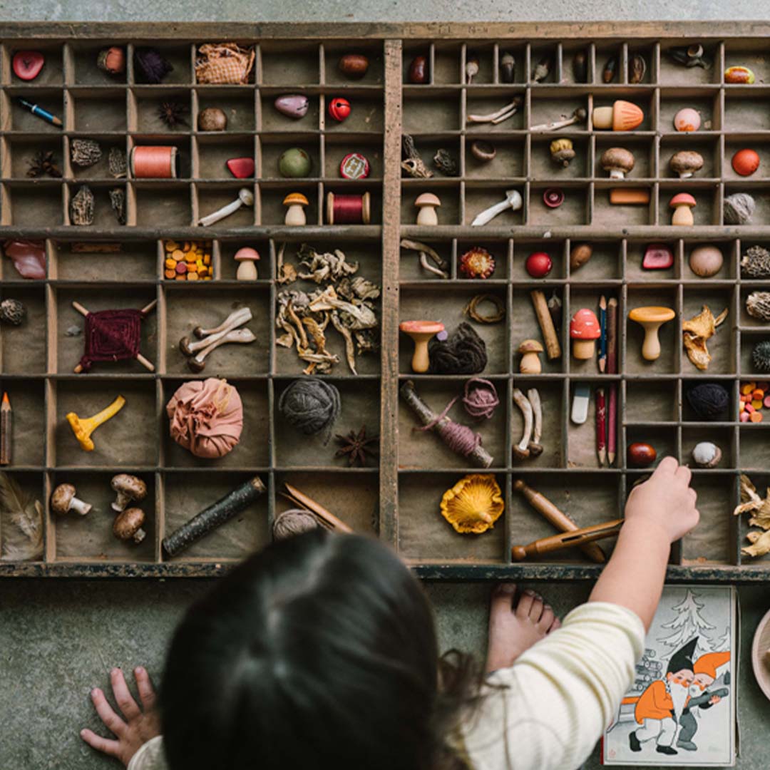 De set bestaat uit 18 paddenstoelen met een formaat van 1 tot 4,5 centimeter, met verschillende vormen en kleuren. De loose parts liggen prettig in de hand en zetten aan tot creatief spel, of ze nu in een fantasielandschap terechtkomen of dienstdoen als herfstige versiering op de seizoenstafel. Door de eenvoudige vormgeving kunnen kinderen hun eigen verhalen en spelvormen creëren en ontstaat er steeds iets nieuws.