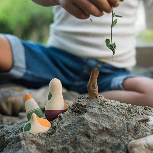 Drie abstract vormgegeven speelfiguren 'Ooh-la-la!' uit de serie 'Wild' van het Spaanse merk Grapat die de fantasie prikkelen en uitnodigen tot het maken van verhaaltjes.