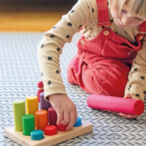 Veelzijdige constructie rollers. Deze houten speelgoedstaven van het Duitse merk Grimm's zijn multi inzetbaar. Als pilaren bij het bouwen van huizen en kastelen of het stapelen van torens.