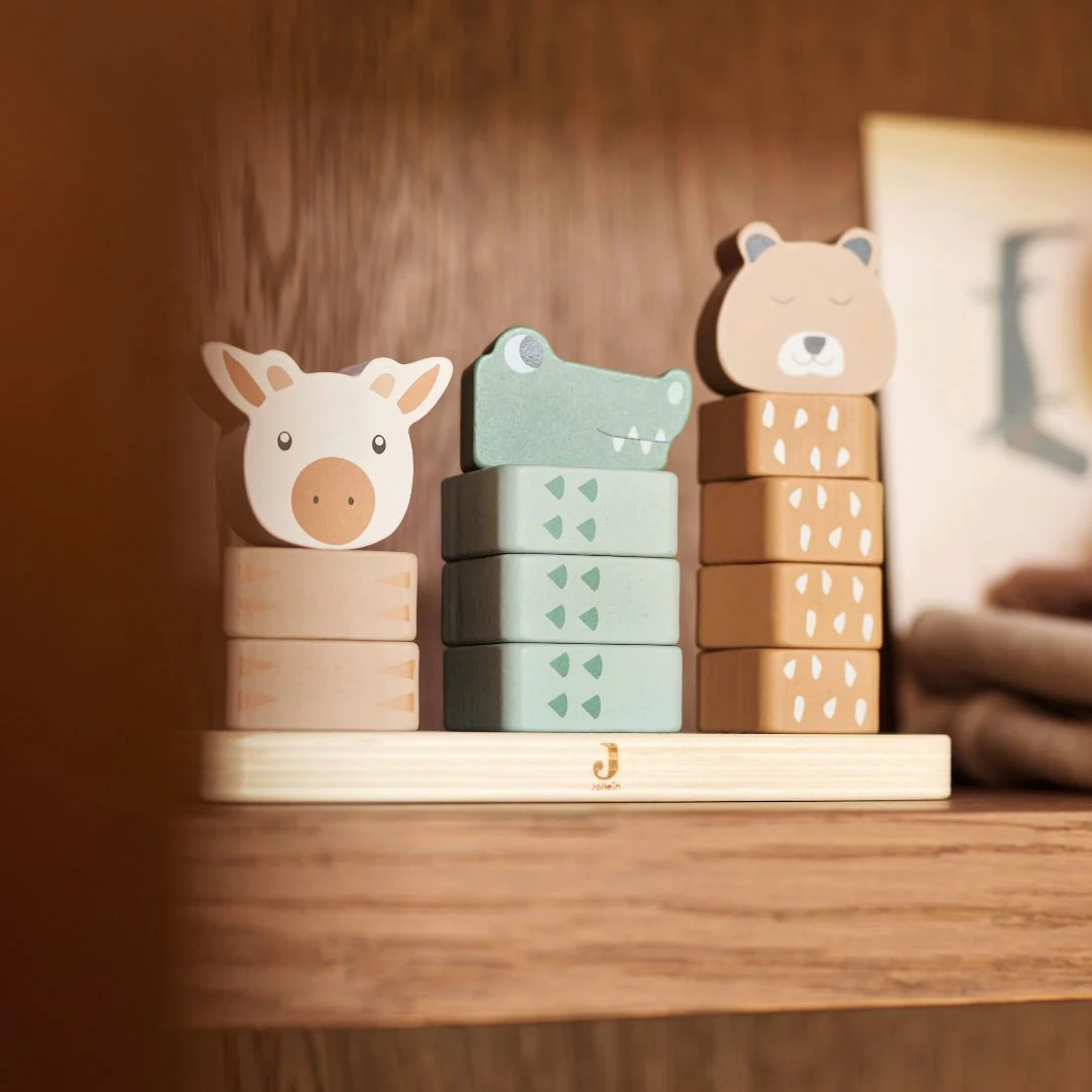 De kleurrijke stapeltoren 'Jungle Jambo' van het Nederlandse merk Jollein zorgt gegarandeerd voor speelplezier. De guitige dierenkopjes bovenop de torens zijn haast onweerstaanbaar.