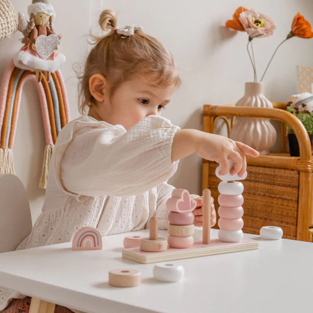 Speelplezier voor kleine ontdekkers met de 'Little Stacking Rings - Pink' van het Belgische merk Label Label. Dit vrolijk gekleurd speelgoed is fijn stapelen voor kleine handjes.