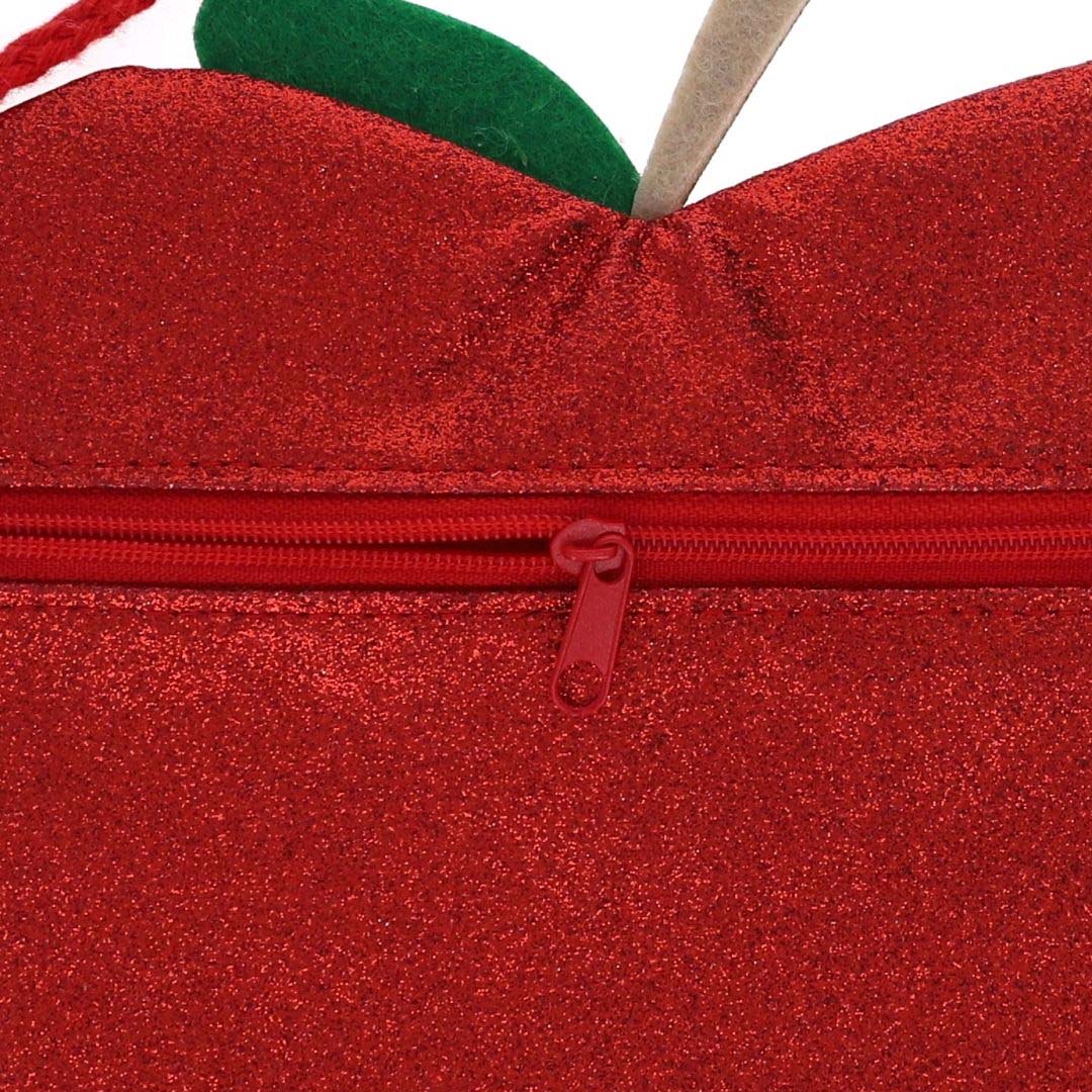 Het kindertasje heeft de vorm van een appel met steeltje en is compleet bezaaid met glitters. Deze glinsterende appel heeft een lang, smal schouderbandje en sluit met een rits.