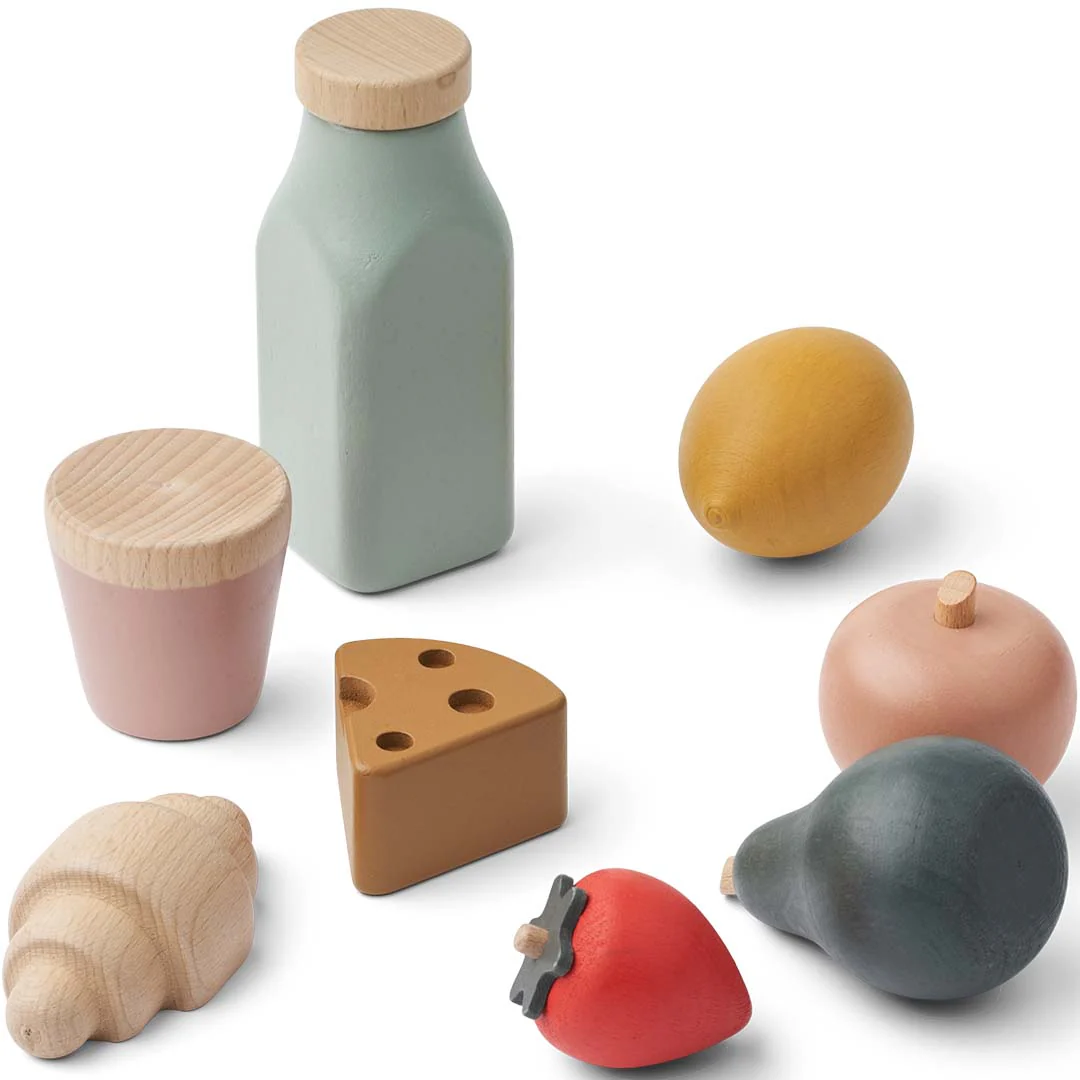 Met sappig houten fruit als citroen, aardbei, peer en perzik, een vers gebakken croissantje, een goudgeel kaasje, ijs en romige yoghurt, is de kinderkeuken of de speelwinkel goed gevuld.