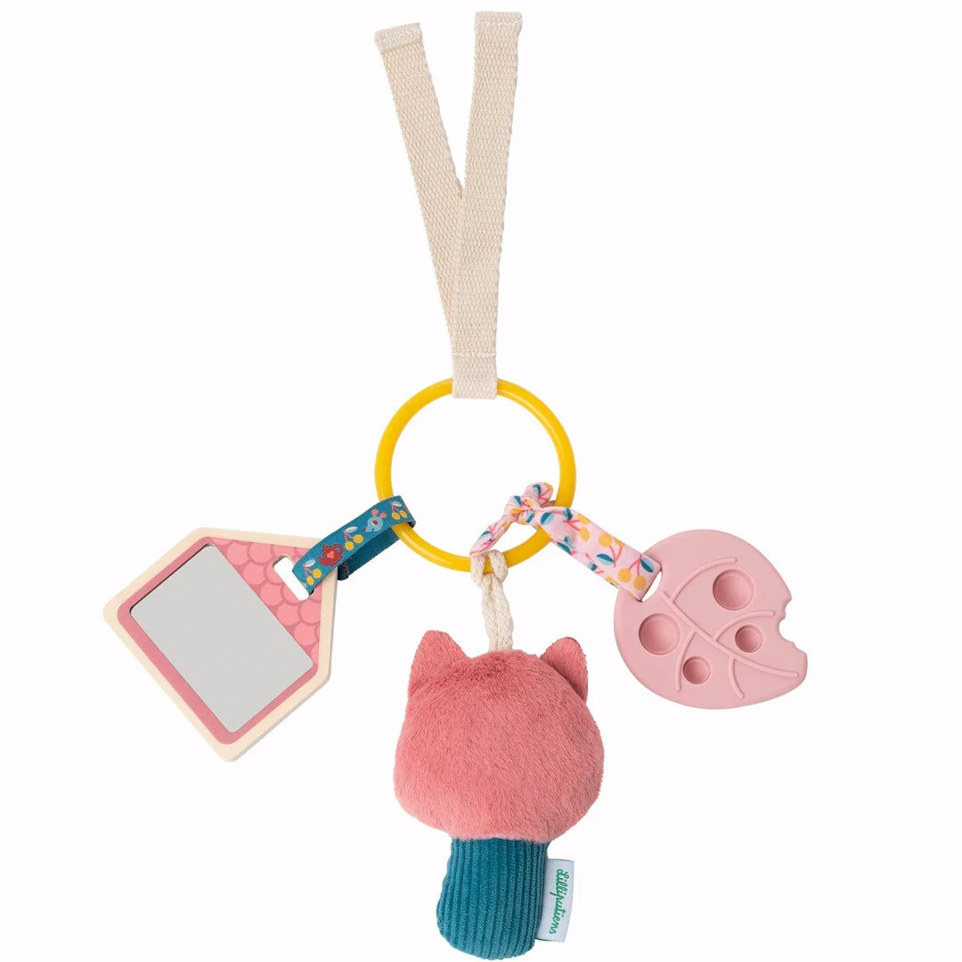 Laat de activiteitenring rammelen, voel het pluche en de corduroy van Jeanne de poes, bijt in de siliconen bijtring met reliëf en ontdek het spiegeltje op het houten huisje. De bungelende figuurtjes nodigen uit om te ontdekken.