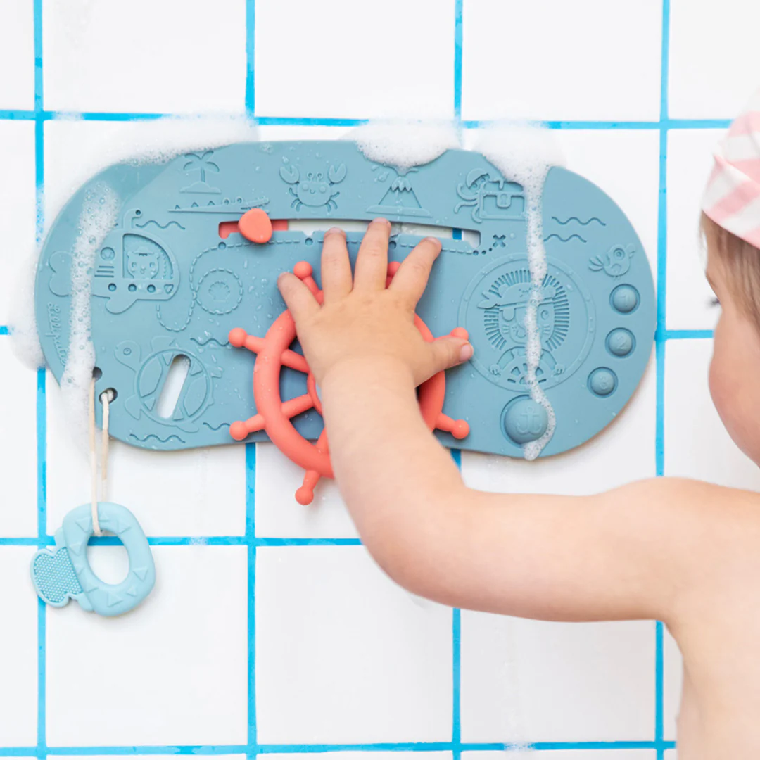 Ga op spetterend wateravontuur met dit badpaneel vol onderwaterillustraties en fantaseer over verre reizen en avonturen op zee. Draai aan het stuur, druk op knopjes en schuif het oranje knopje naar je eindbestemming.