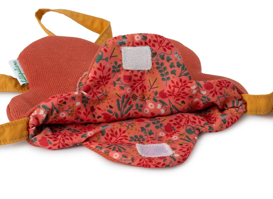 De kleine lappenpop Adele, met haar roestrode haren en roestrode rokje, wordt graag gekoesterd en samen met het stoffen tasje met een icoontje van een vosje stimuleert ze de verbeelding en creatief spel.