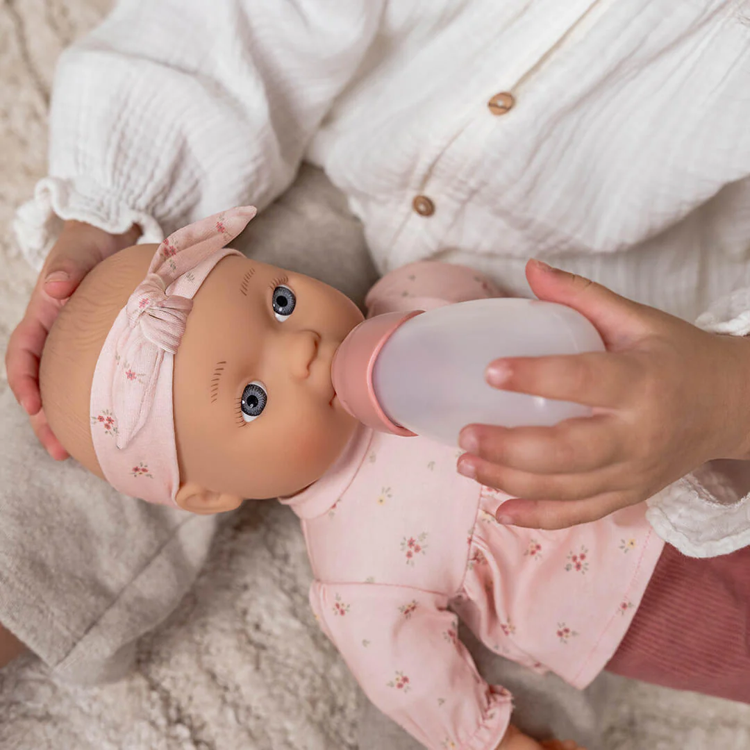 Ze draagt een roze broek met gebloemd truitje en bijpassende haarband. De poppenkleertjes kunnen makkelijk aan- en uitgetrokken worden. De speelgoedpop wordt geleverd met een fopspeen en flesje.