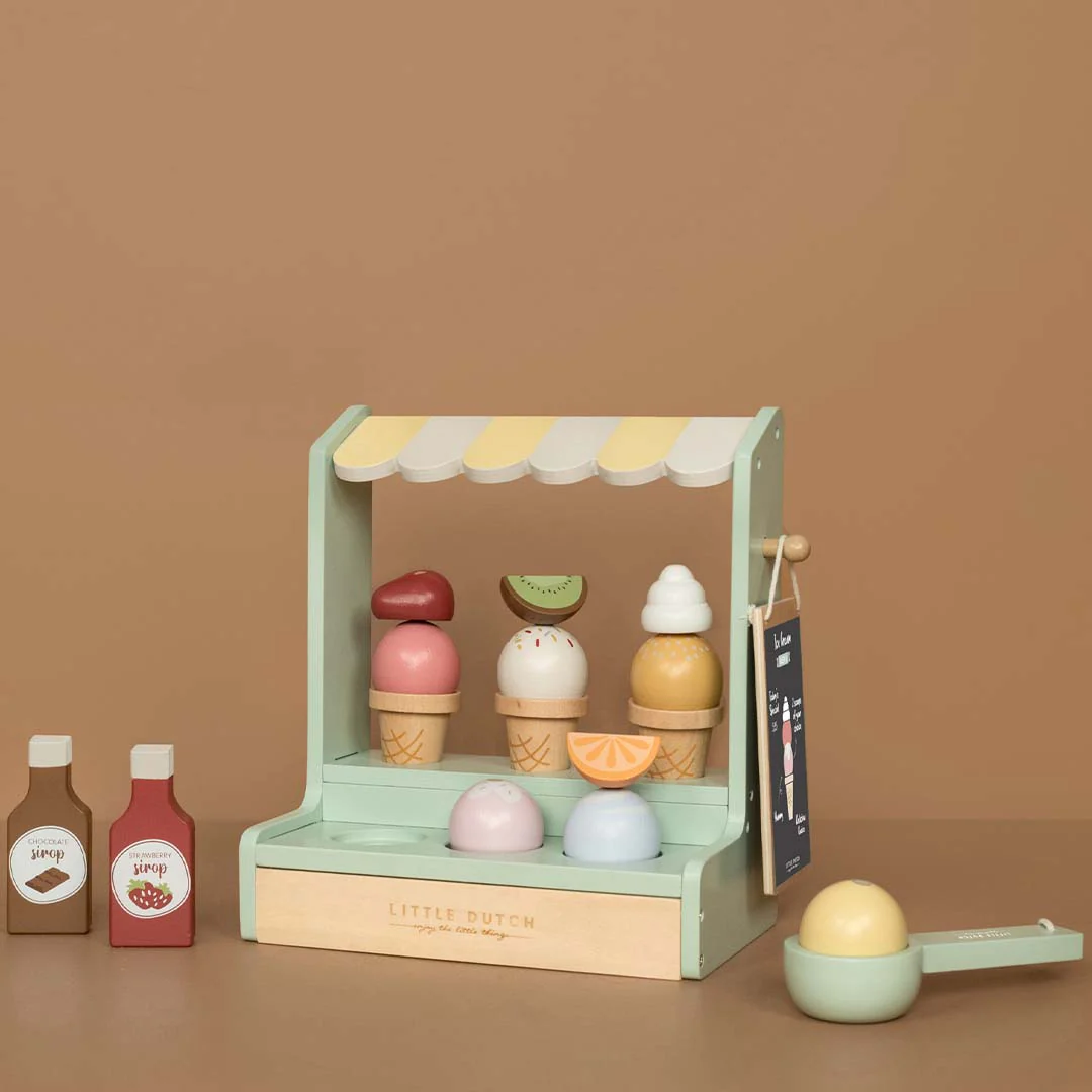 Onder de geel-witte luifel van deze houten ijskraam van het Nederlandse merk Little Dutch worden de lekkerste ijsjes gehaald. Probeer alle smaken en maak de zoete creaties af met heerlijke toppings. Speelgoed dat garant staat voor fantasierijk spel en heel veel speelplezier.