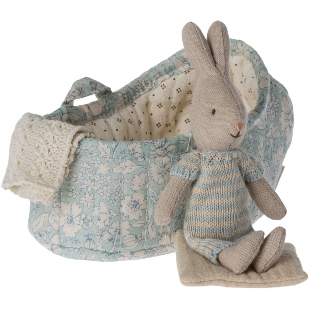 Een knus reiswiegje waarin een klein konijntje 'Rabbit in Carry Cot - Micro' van het Deense merk Maileg comfortabel een dutje doet.