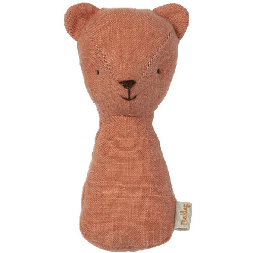 Deze vriendelijke knuffelrammelaar 'Teddy Rattle' van het Deense merk Maileg heeft een geborduurd berensnoetje en is er in vier verschillende, aardse kleuren. Deze worden per stuk assorti geleverd. Het is dus een verrassing welke kleur het wordt.