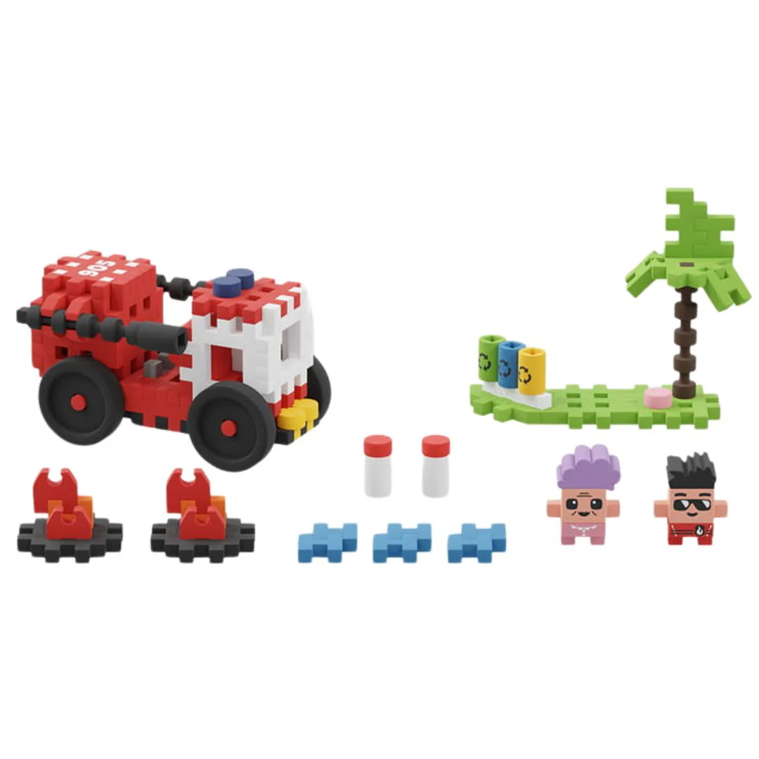 De set bestaat uit verschillende blokjes in de vorm van wafels en twee speelfiguren. Platte, kleine elementen die door de tien uitstekende delen en vier gaten gemakkelijk met elkaar verbonden kunnen worden. Zo kunnen de brandweerauto, het stukje natuur en de overige accessoires gemakkelijk in elkaar gezet worden. Deze brandweerset bestaat uit 80 onderdelen, waarmee de wafels met hun formaat van 3,5 cm perfect in speelse kinderhandjes passen.