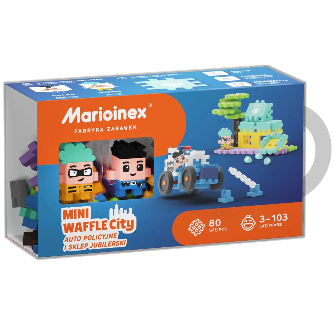 Boeven hebben geen schijn van kans dankzij met de 'Mini Waffle - Police Car & Jewelry Store' set van het Poolse merk Marioinex. Boef Gizmo krijgt geen juwelen uit de winkel meer te pakken met politieagent Chase en zijn stoere auto op zijn hielen. Of speel juist als de boef en trotseer de politie, het kan allemaal.