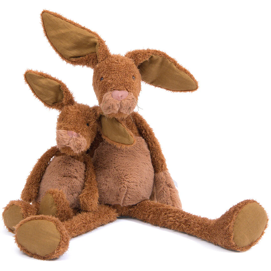 Aan zijn lange, slungelige poten is de konijnenknuffel gemakkelijk vast te grijpen. Zijn aaibare vacht en grote oren maken de knuffel heerlijk om mee te troetelen en te knuffelen.