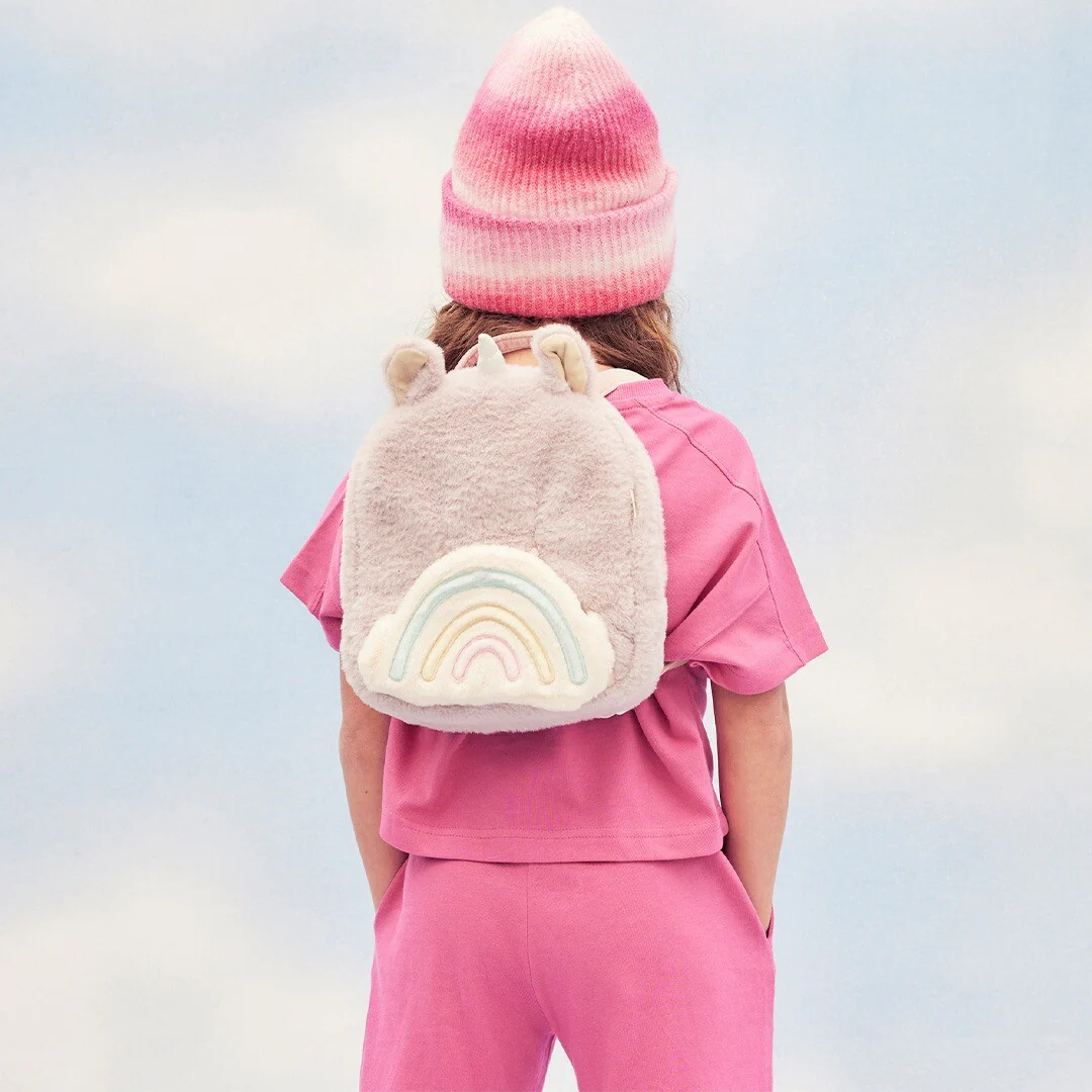 Het regenboogzakje op de voorkant van de tas biedt voldoende ruimte om kleine Dinky vriendjes in mee te nemen. Het voorvakje beschikt over elastische lussen en beengaten voor optimaal comfort voor de knuffelvriend of vriendin.