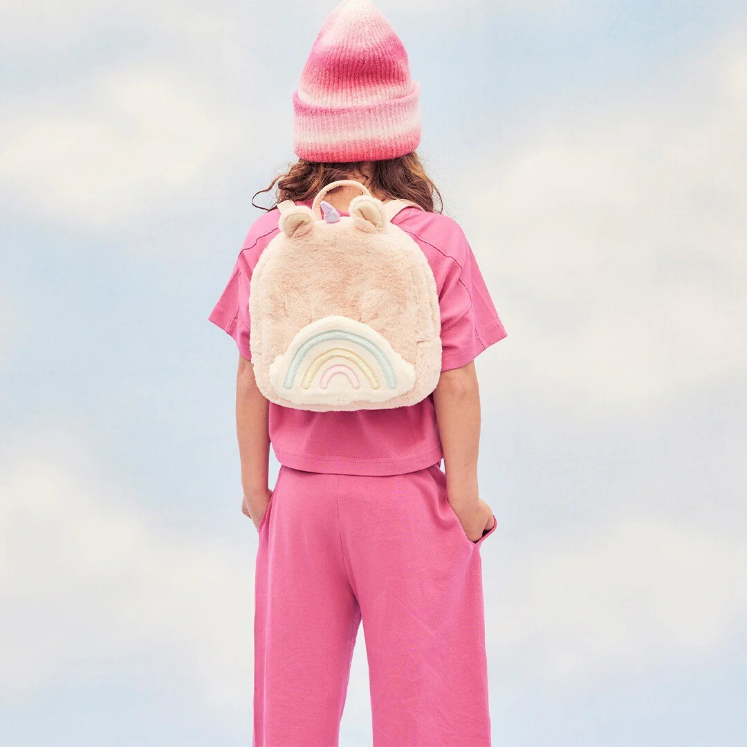 Neem vriendjes uit de Dinky collectie mee op pad in het zitje van deze kleuterrugzak 'Hopalong Unicorn - Pink' van het Engelse merk Olli Ella. De rugzak, gemaakt van een fluweelzachte roze stof, afgewerkt met lieflijke oortjes en een glinsterende iriserende hoorn, is net zo magisch als knuffelbaar.