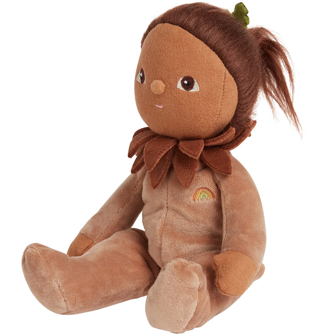 Vermomd als herfstig eikeltje, kan deze kleine lappenpop 'Dinky Dinkums Doll - Allie Acorn' van het Engelse merk Olli Ella, altijd mee op stap. De kleine knuffelpop, in limited-edition uit de serie Forest Friends, draagt een aaibare fluwelen onesie in het bruin en heeft een staartje in het haar.