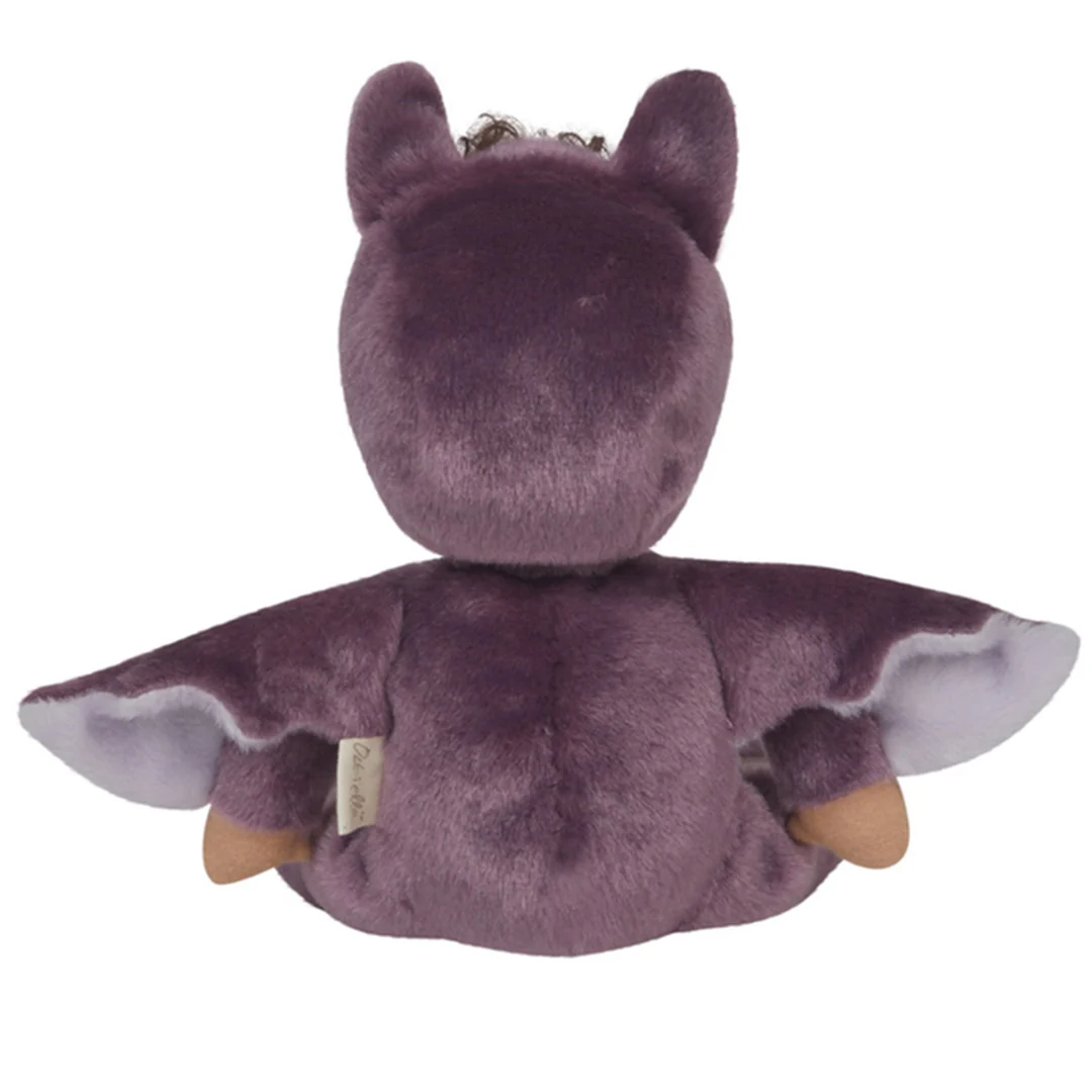 Vermomd als vleermuisje kan de kleine lappenpop met krullende haardos 'Dinky Dinkum Doll - Bowie Bat - Purple' van het Engelse merk Olli Ella altijd mee op stap.