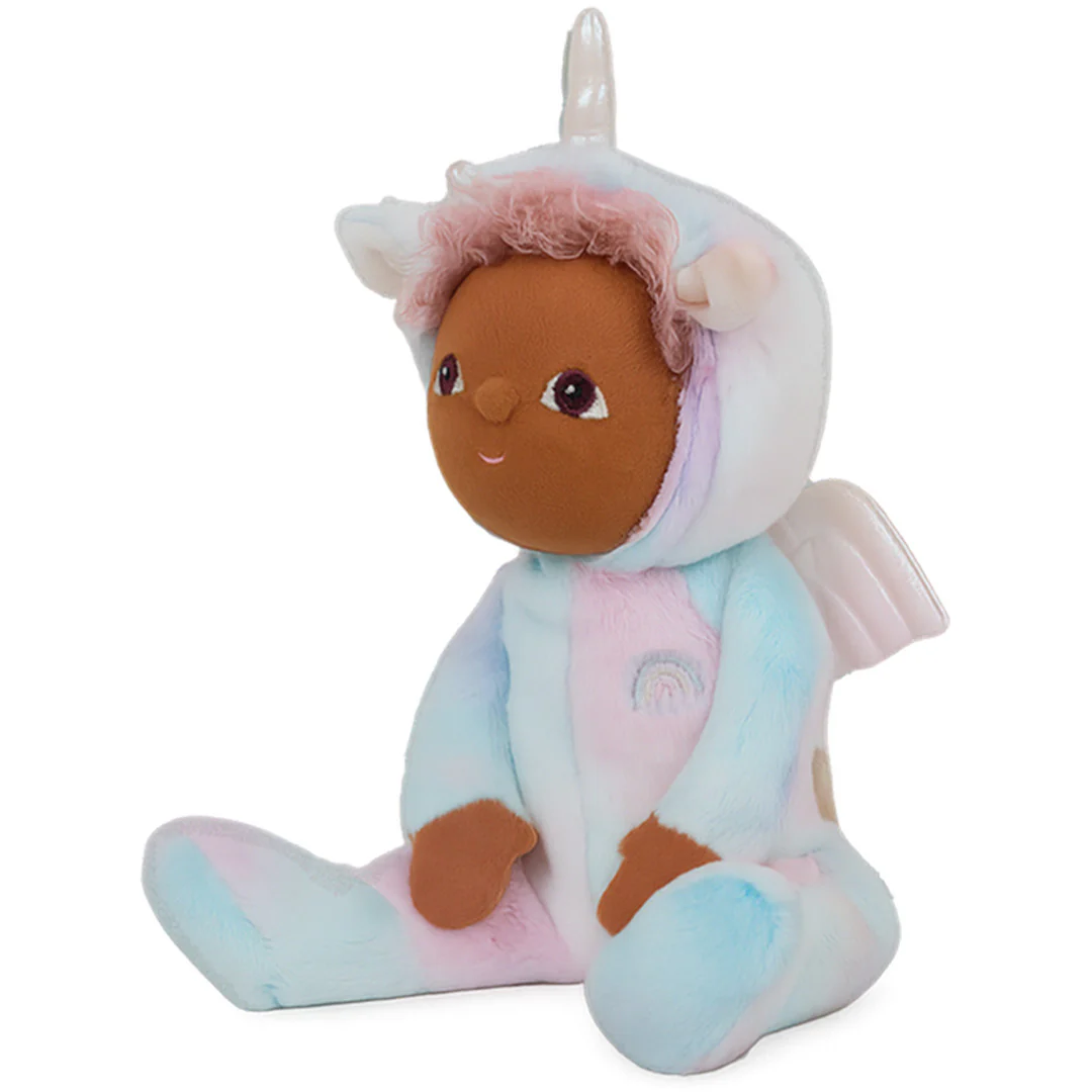 Vermomd als eenhoorn kan de kleine lappenpop met krullende haardos 'Dinky Dinkum Doll - Uli Unicorn - Rainbow' van het Engelse merk Olli Ella altijd mee op stap.
