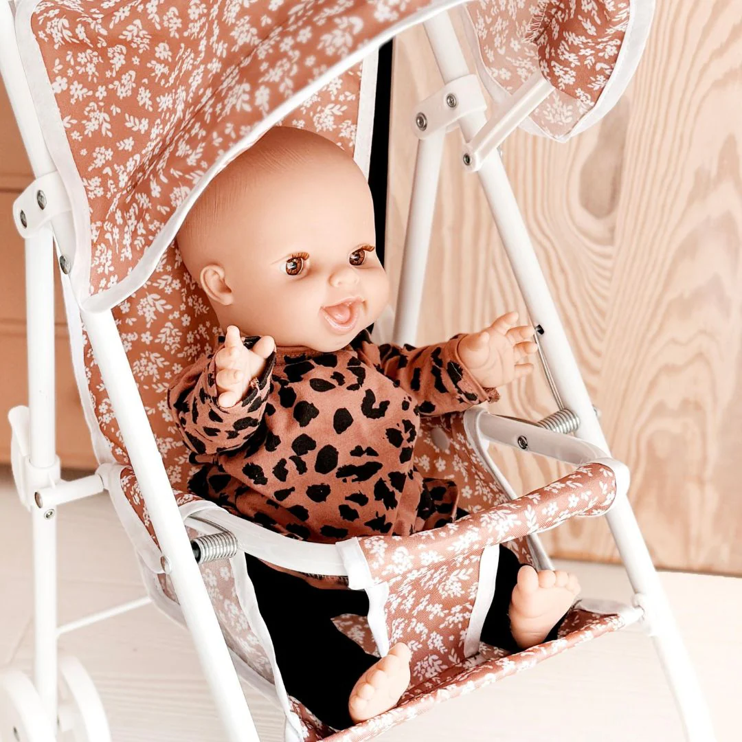 De poppenwagen 'Stroller Terra Flower' van het Nederlandse merk vanPauline is een realistische speelgoedbuggy om lievelingspoppen en -knuffels mee op stap te nemen. De buggy is uitgevoerd in terracotta-kleurige stof met een dessin van witte bloemen.
