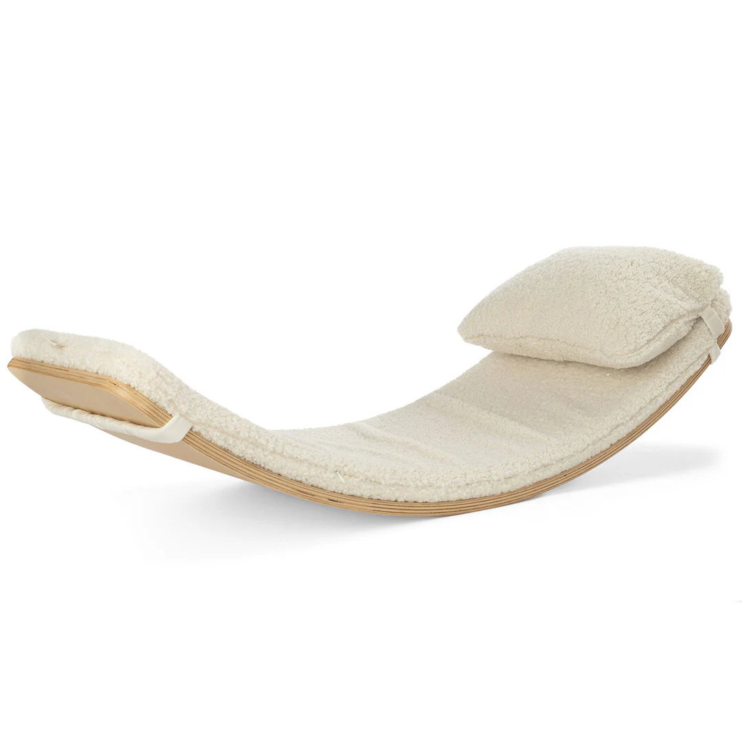 Heerlijk liggen op de Wobbel XL met het zachte Wobbel-kussen 'Teddy' van Wobbel. Zo wordt de Wobbel XL comfortabel om te liggen en even pauze te houden of een boek te lezen.